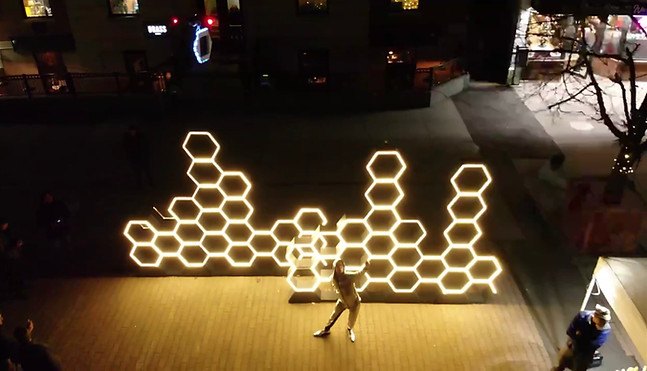 Drone was commissioned as a public light installation by the City of Somerville, Massachusetts. It stands 10 feet tall and 24 feet wide, built from 48 wooden hexagons and over 350 meters of LED light strips. The structure survived a full New England winter.